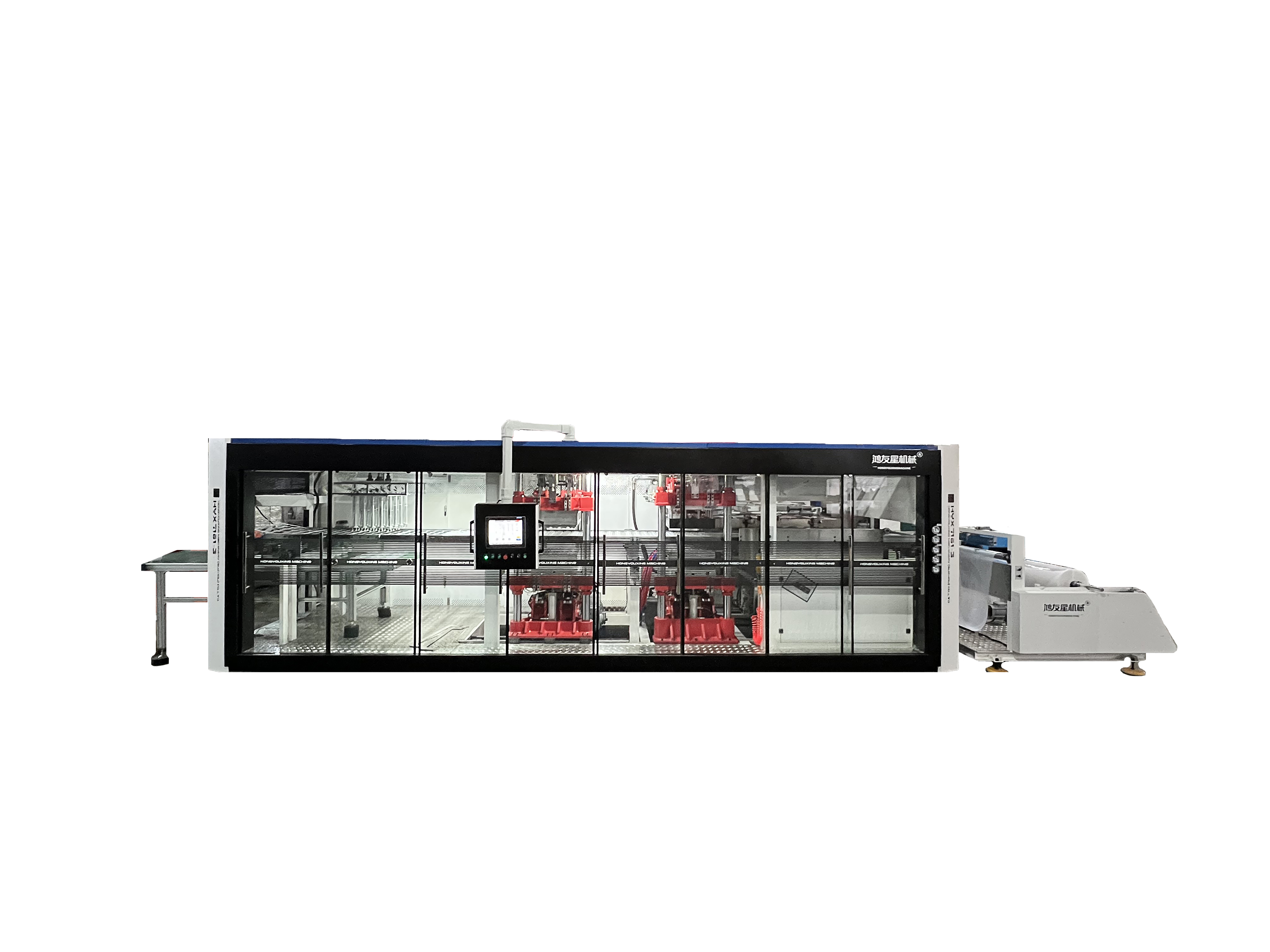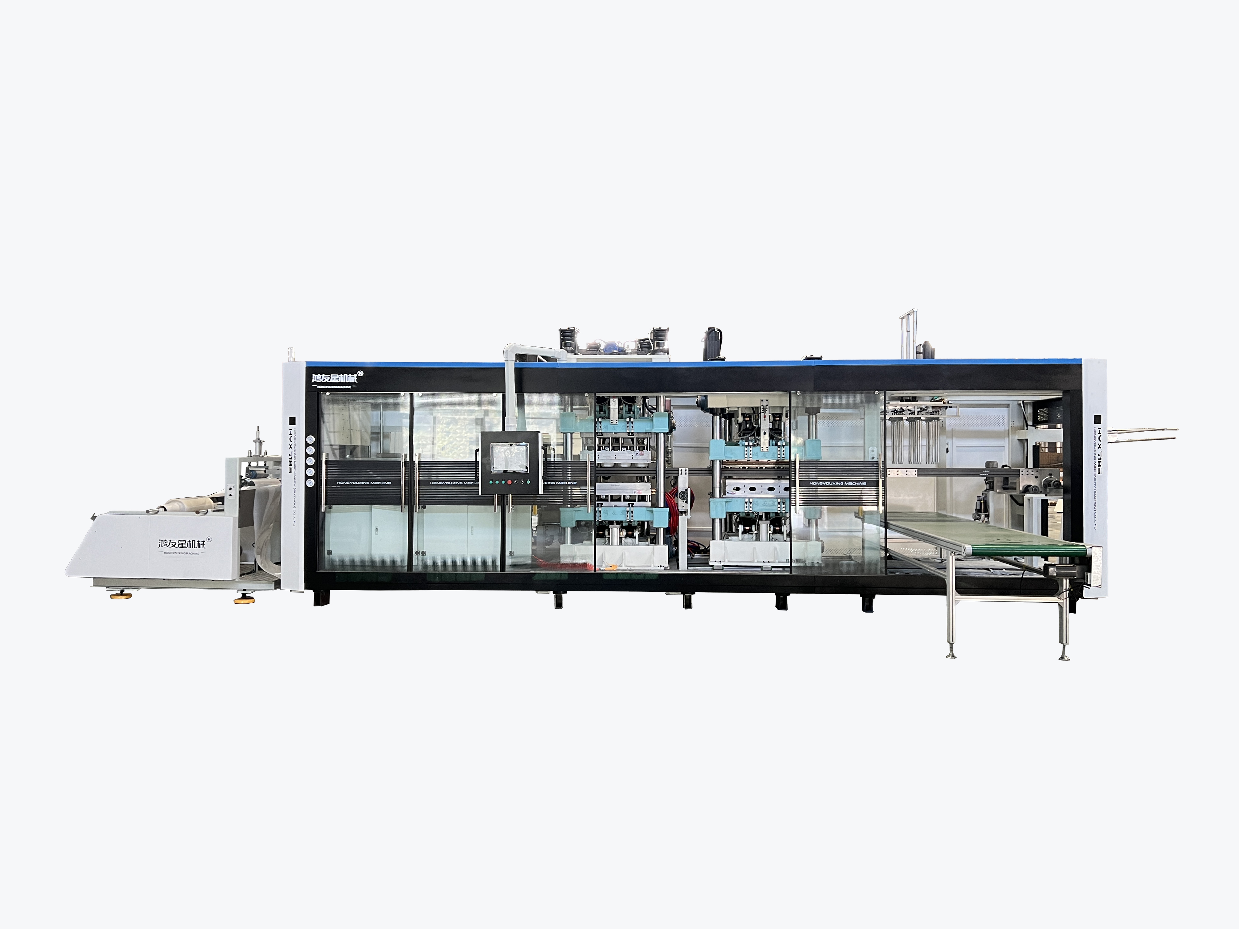 我們的主要產(chǎn)品有 HYX-850全自動(dòng)正負(fù)壓3/4工位熱成型機(jī)(成型-裁切-沖孔-堆疊)、 HYX-1220 PLC全電腦控制自動(dòng)真空熱成型機(jī)、 HW-7072負(fù)壓成型裁切一體機(jī)(成型-裁切-堆疊)、 HW-730自動(dòng)氣壓成型杯蓋碗機(jī)、 厚片吸塑機(jī)、 30-150T液壓裁斷機(jī)、 冷水機(jī)和空壓機(jī)等輔機(jī)、 熱成型模具。